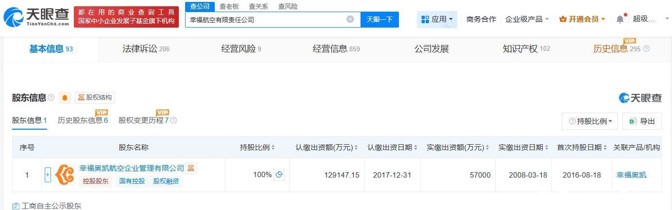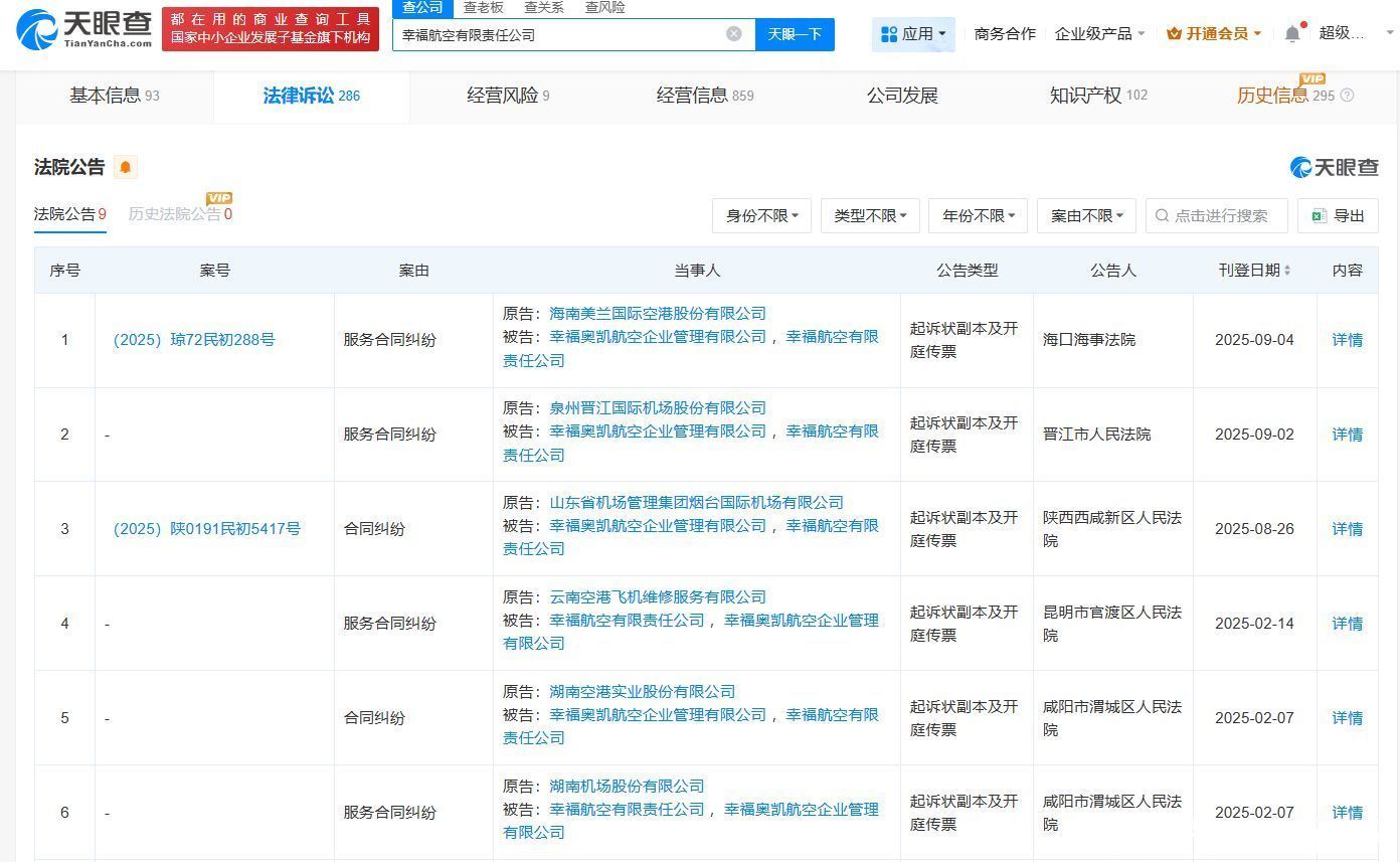 幸福航空有限责任公司成立于2008年3月,法定代表人为彭仕兵,注册资本约12.9亿人民币,经营范围包括公共航空运输、货物进出口、民用航空器维修等。股东信息显示,该公司由幸福奥凯航空企业管理有限公司全资持股。值得注意的是,此前,该公司及股东已被泉州晋江国际机场股份有限公司、山东省机场管理集团烟台国际机场有限公司、湖南空港实业股份有限公司起诉。